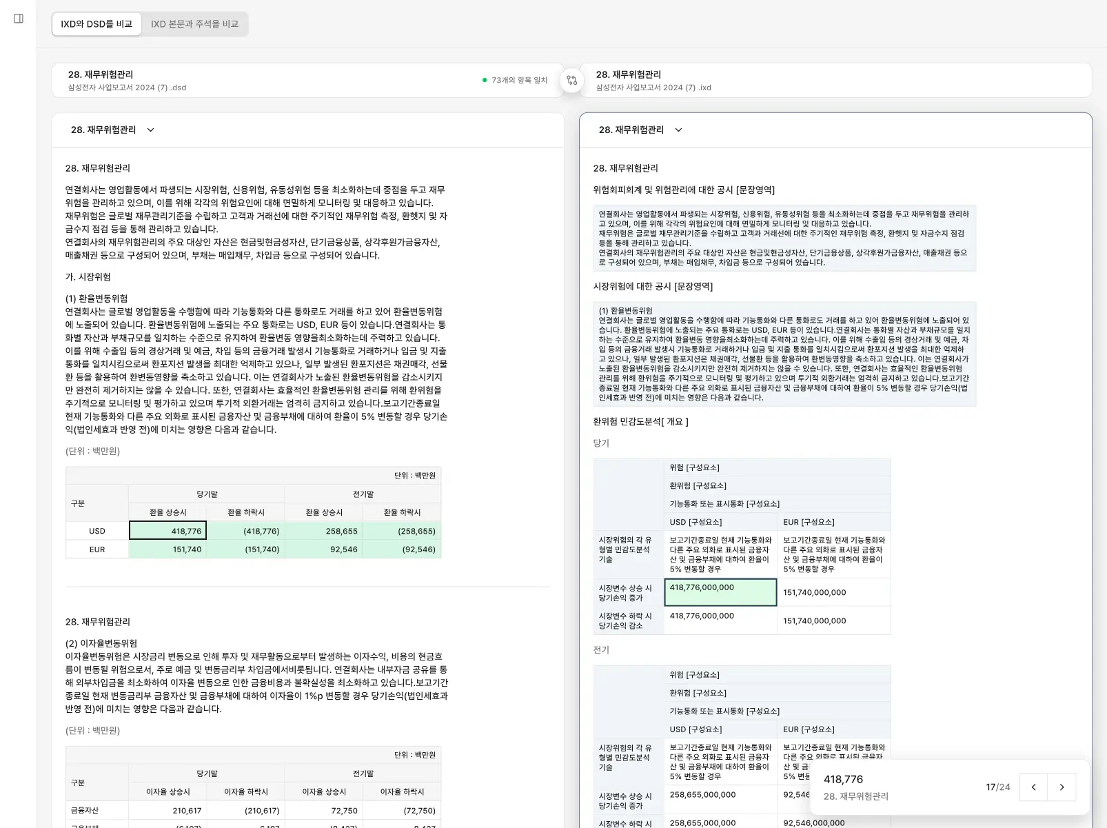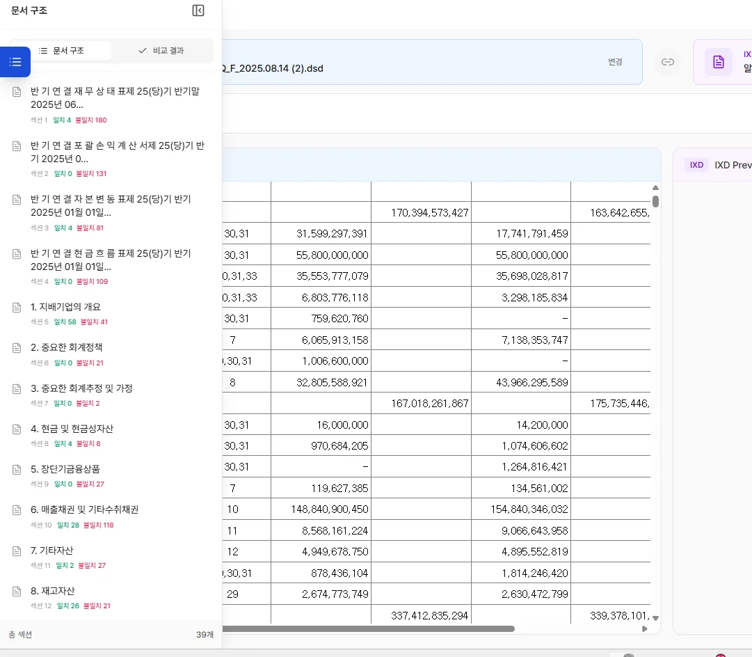 XBRL(IXD)과 재무제표(DSD) 간의 수치 및 단위 정합성을 1원 단위까지 정밀하게 대조합니다.