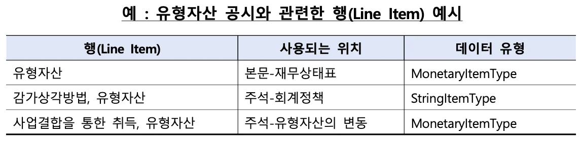 Line item은 재무제표 본문과 주석 표에서 행을 구성하는 요소입니다. 매출액, 유형자산처럼 회계 개념을 구체적으로 나타내는 개념이며, 각 항목마다 데이터 타입과 속성이 부여되어 있습니다. 데이터 유형과 속성이 무엇인지는 아래에서 설명할게요.
