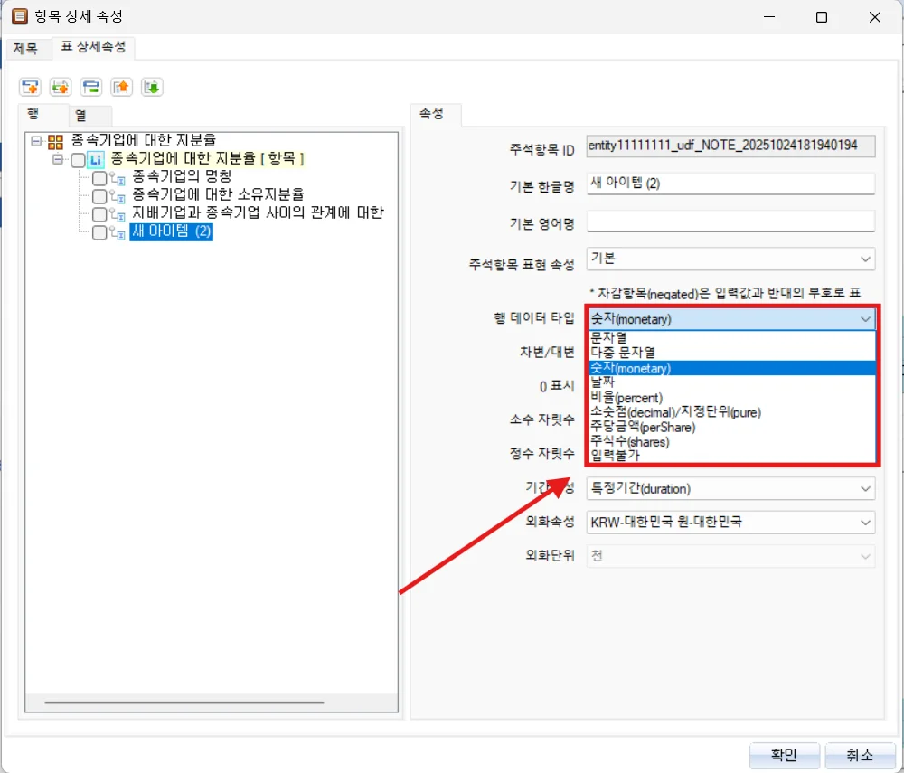 행 탭에서 태그를 확장하면 데이터 타입을 설정해야 하는데요.